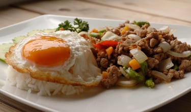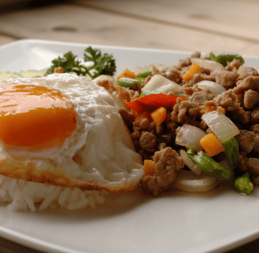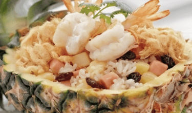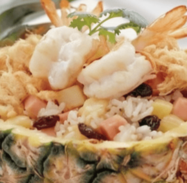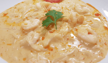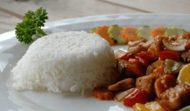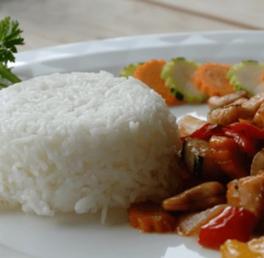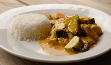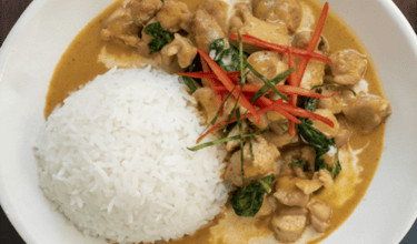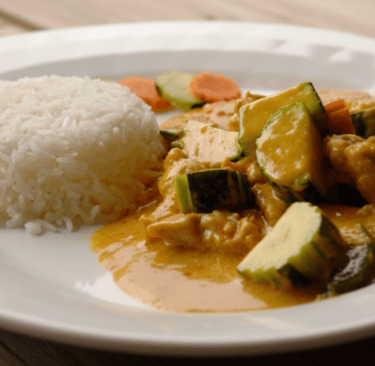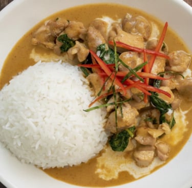Straccetti di maiale al curry rosso, latte di cocco e riso