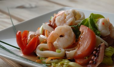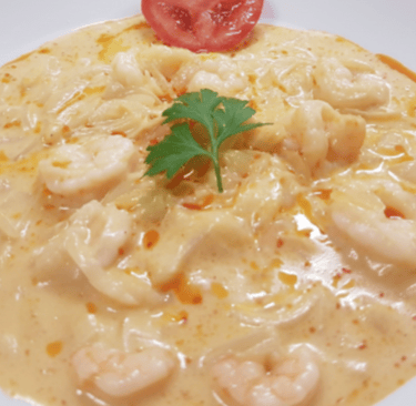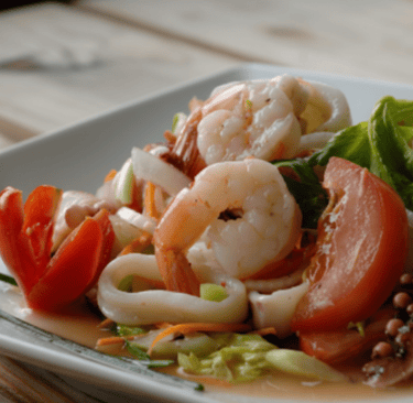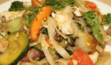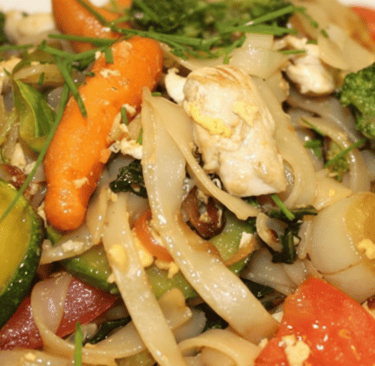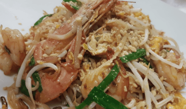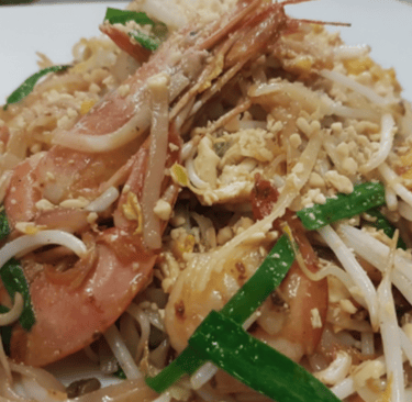 Tagliolini di riso con gamberetti, salsa pad thai e germogli di soia