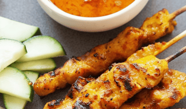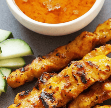 Spiedini di pollo marinati con salsa piccante e noccioline